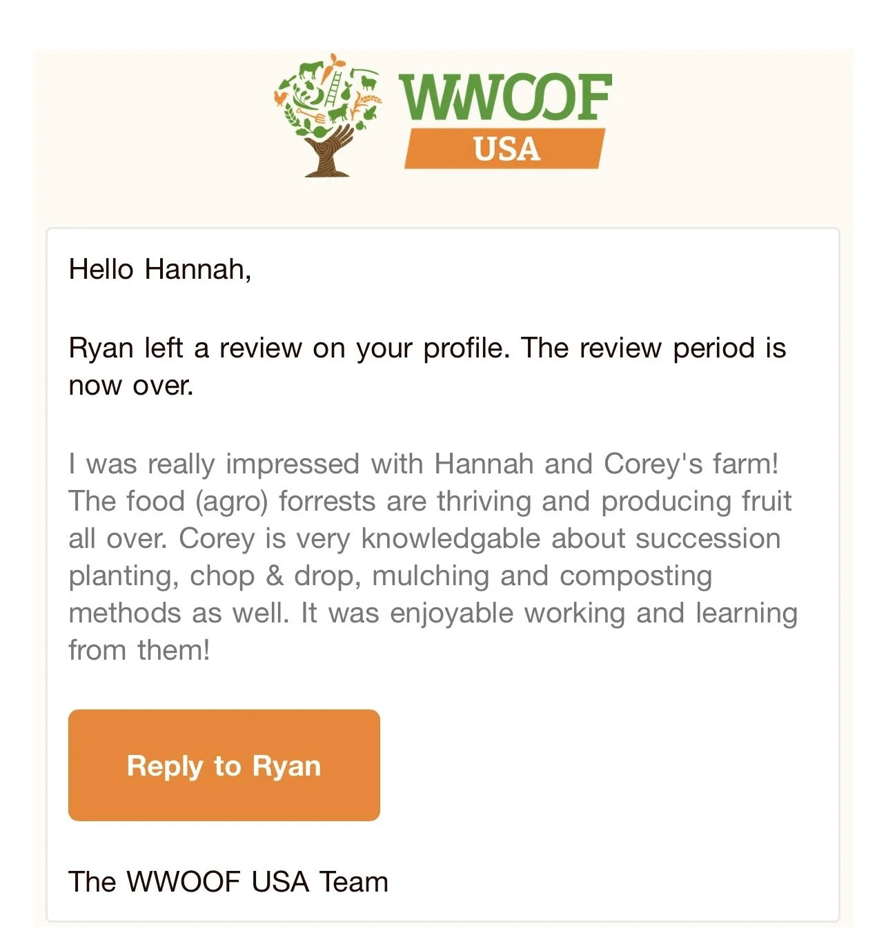 “Working for the love farm is super peaceful. there is work to be done either in the garden or around the property building things! YOU’RE NOT LIVING HERE AND WORKING HERE IF YOU DON’T WANT PEACE AND TRANQUILITY! 3 LOVELY DOGS TO PLAY WITH! ENOUGH FRUITS AND VEGGIES FOR YOU TO EAT AS WELL! PLENTY OF SPOTS TO SIT AND ENJOY THE SCENERY! I’D SAY THE BEST PART WORKING ON THE FARM IS CORY AND HANNAH! TWO BEAUTIFUL BEINGS THAT LOVE HELPING AND TEACHING YOU THE WAYS OF FARM LIFE.”